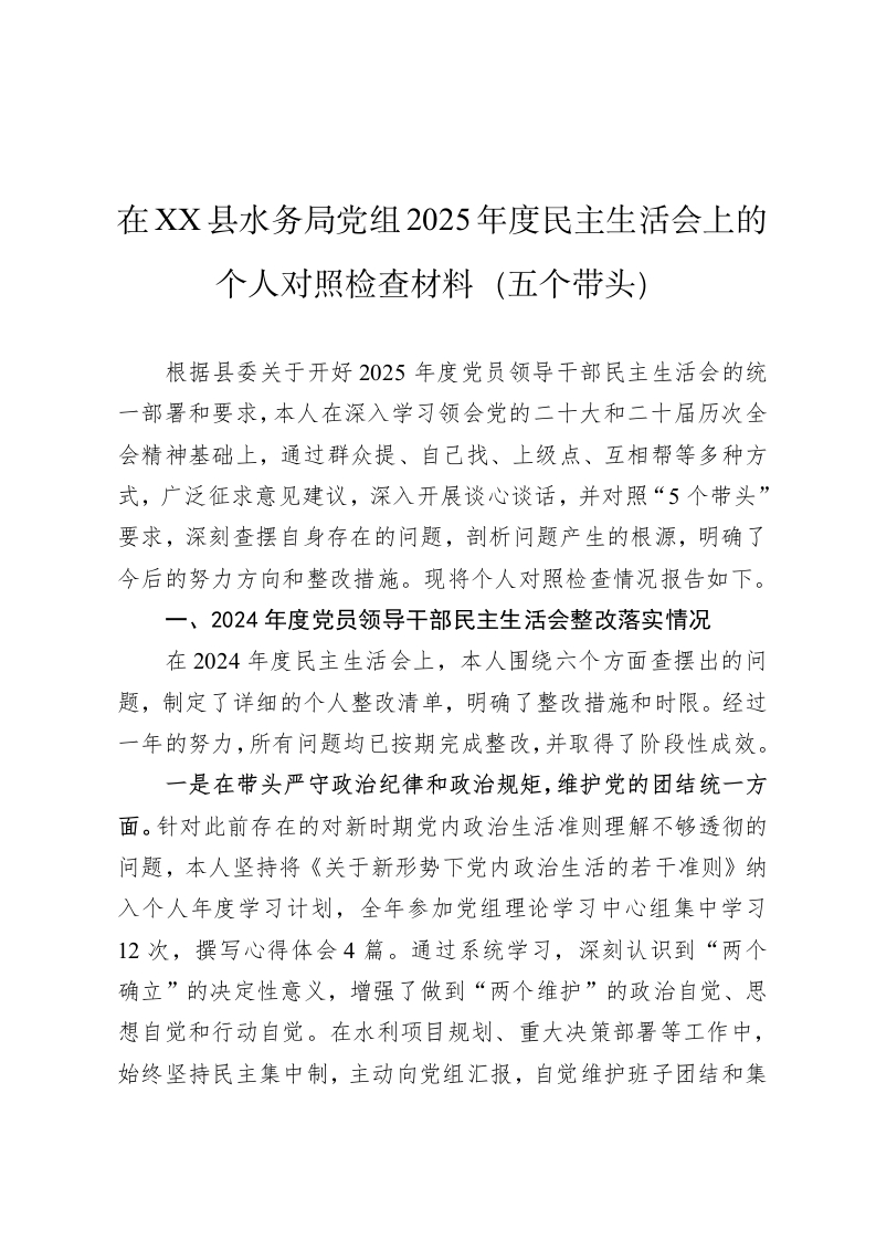 在XX县水务局党组2025年度民主生活会上的个人对照检查材料(五个带头)