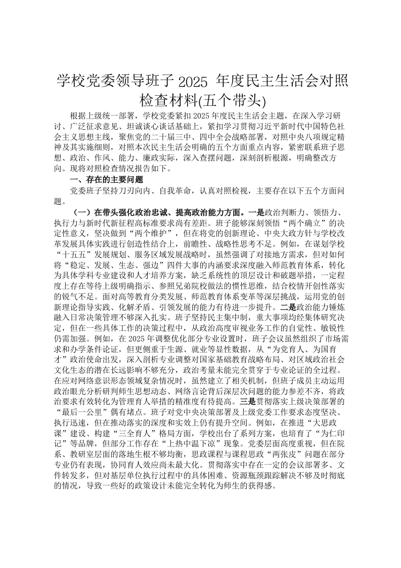学校党委领导班子2025年度民主生活会对照检查材料(五个带头)