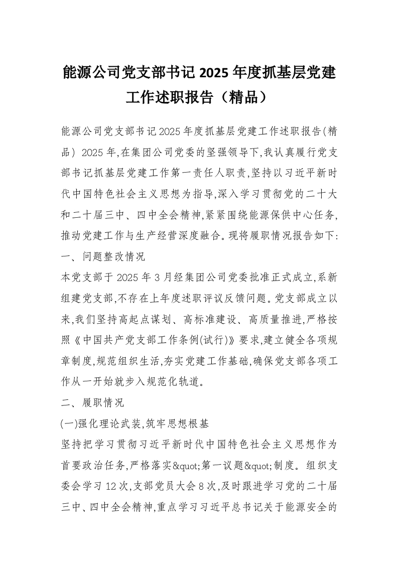 能源公司党支部书记2025年度抓基层党建工作述职报告(精品)