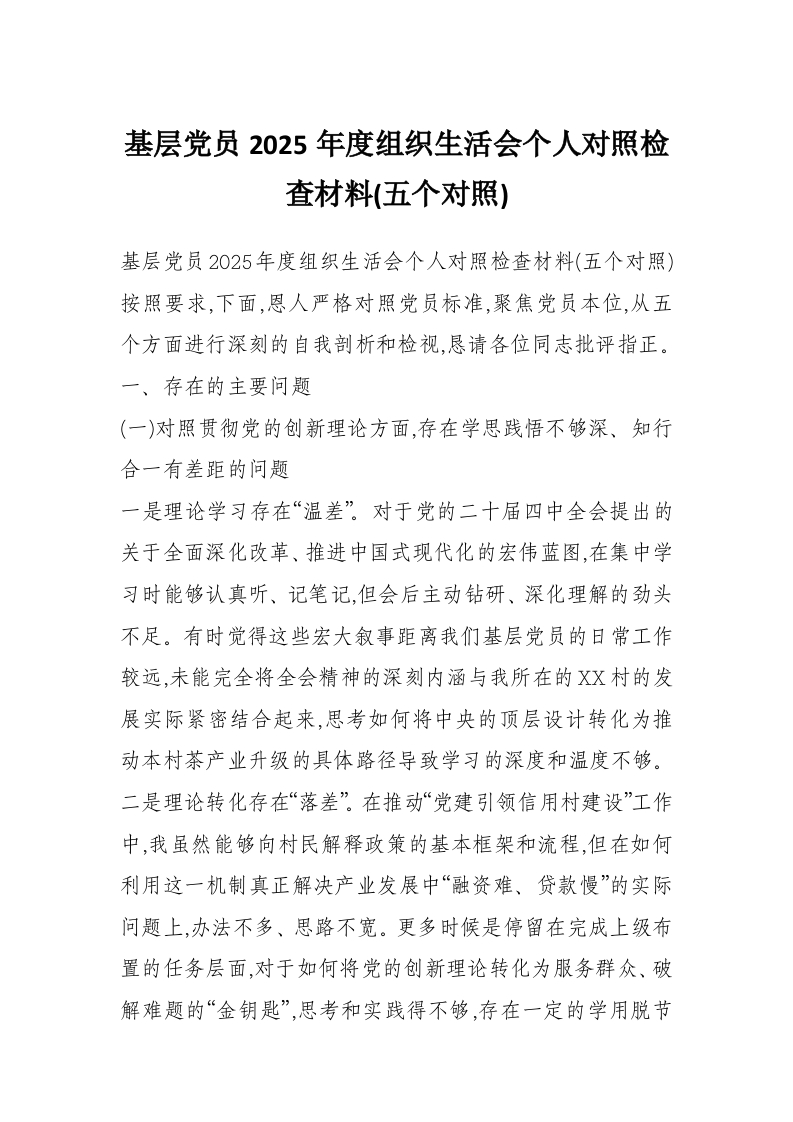 基层党员2025年度组织生活会个人对照检查材料(五个对照)