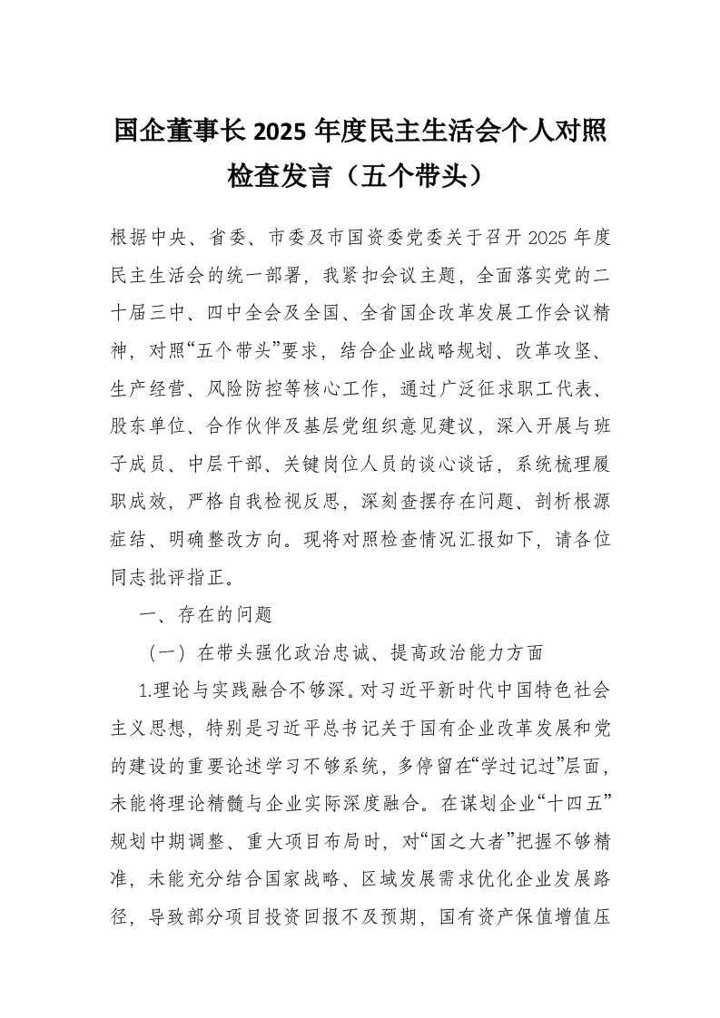 首页写作素材国企董事长2025年度民主生活会个人对照检查发言(五个带头)
