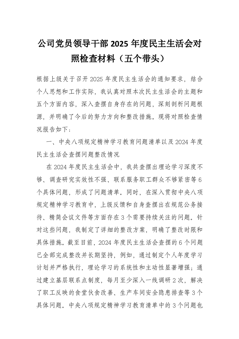 首页写作素材公司党员领导干部2025年度民主生活会对照检查材料(五个带头)