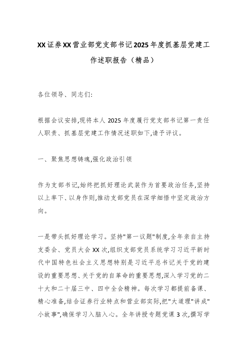 XX证券XX营业部党支部书记2025年度抓基层党建工作述职报告(精品)_副本