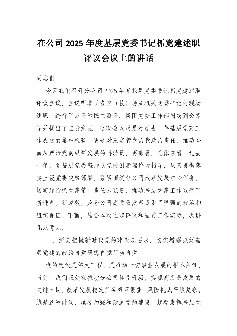 在公司2025年度基层党委书记抓党建述职评议会议上的讲话