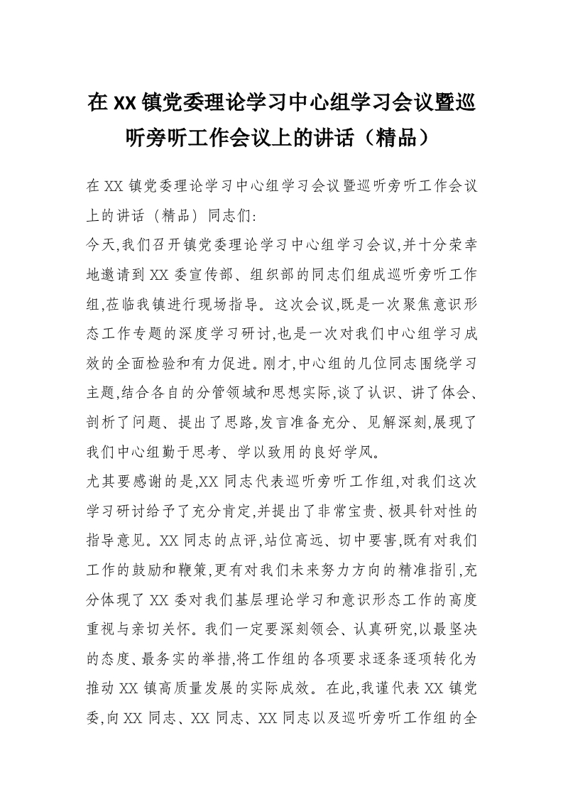 首页讲课讲稿在XX镇党委理论学习中心组学习会议暨巡听旁听工作会议上的讲话(精品)