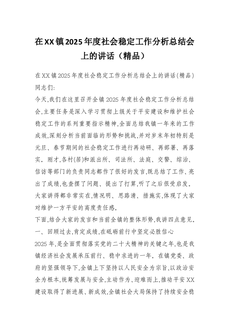 在XX镇2025年度社会稳定工作分析总结会上的讲话(精品)