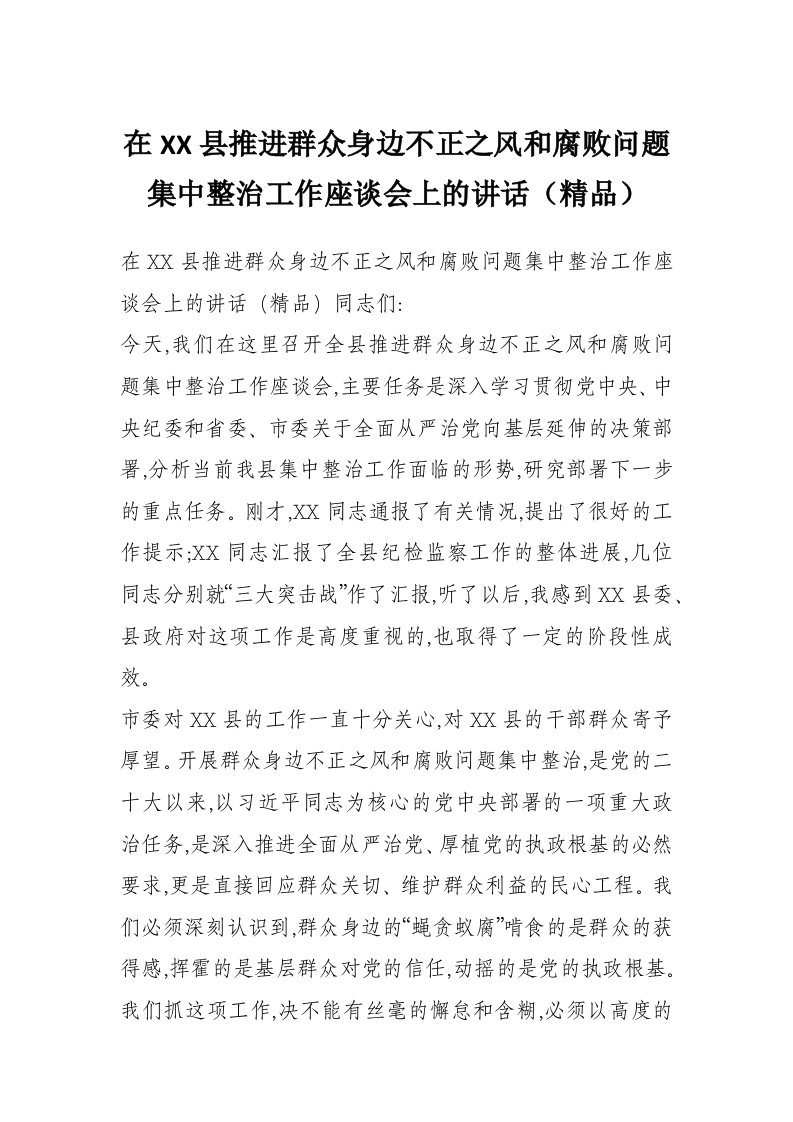在XX县推进群众身边不正之风和腐败问题集中整治工作座谈会上的讲话(精品)
