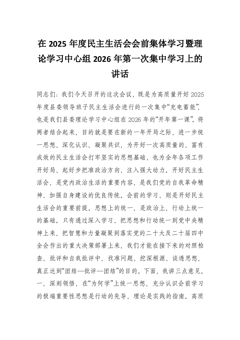 在2025年度民主生活会会前集体学习暨理论学习中心组2026年第一次集中学习上的讲话