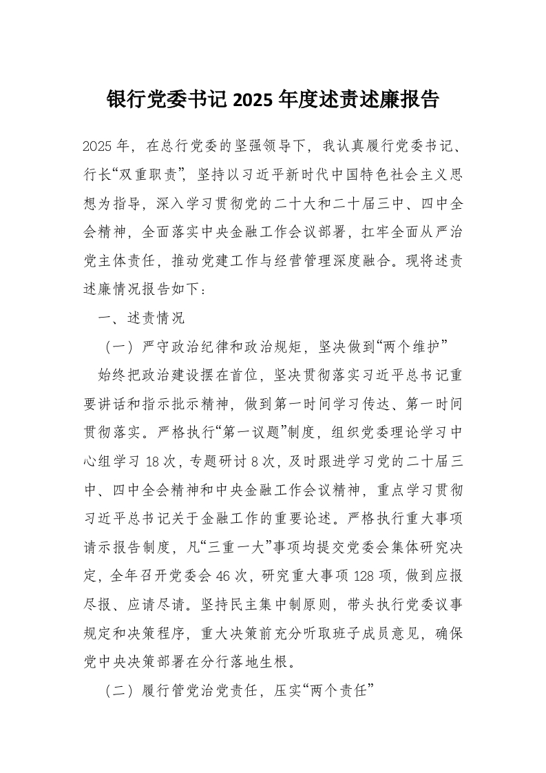 银行党委书记2025年度述责述廉报告