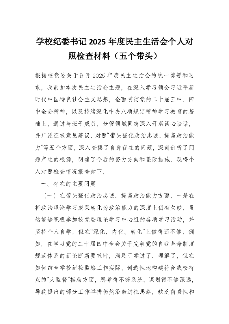 学校纪委书记2025年度民主生活会个人对照检查材料(五个带头)