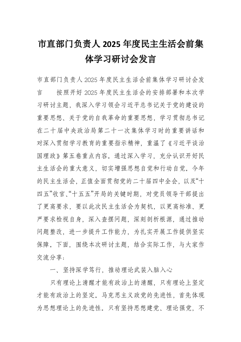 首页材料汇编市直部门负责人2025年度民主生活会前集体学习研讨会发言