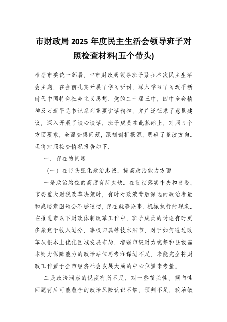 首页材料汇编市财政局2025年度民主生活会领导班子对照检查材料(五个带头)