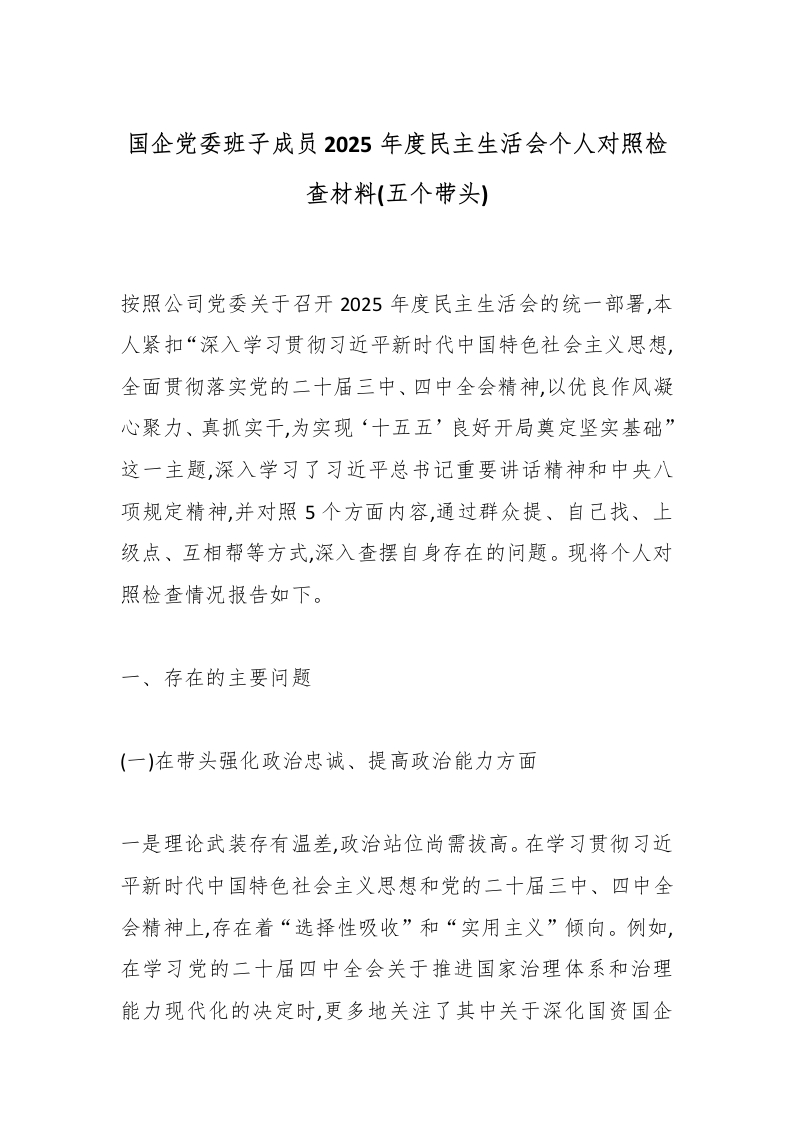 首页精选范文国企党委班子成员2025年度民主生活会个人对照检查材料(五个带头)_副本