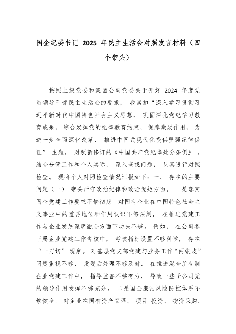 首页精选范文国企纪委书记 2025 年民主生活会对照发言材料(四个带头)_副本
