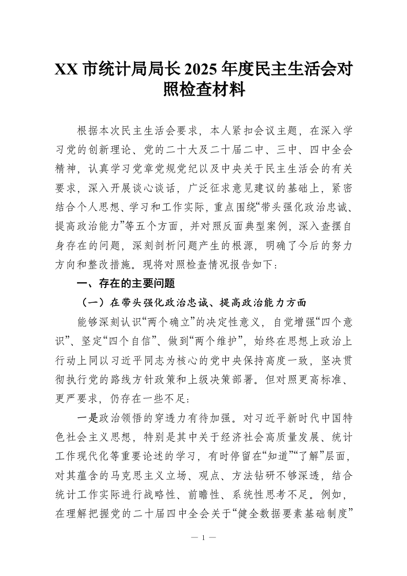 首页讲课讲稿XX市统计局局长2025年度民主生活会对照检查材料