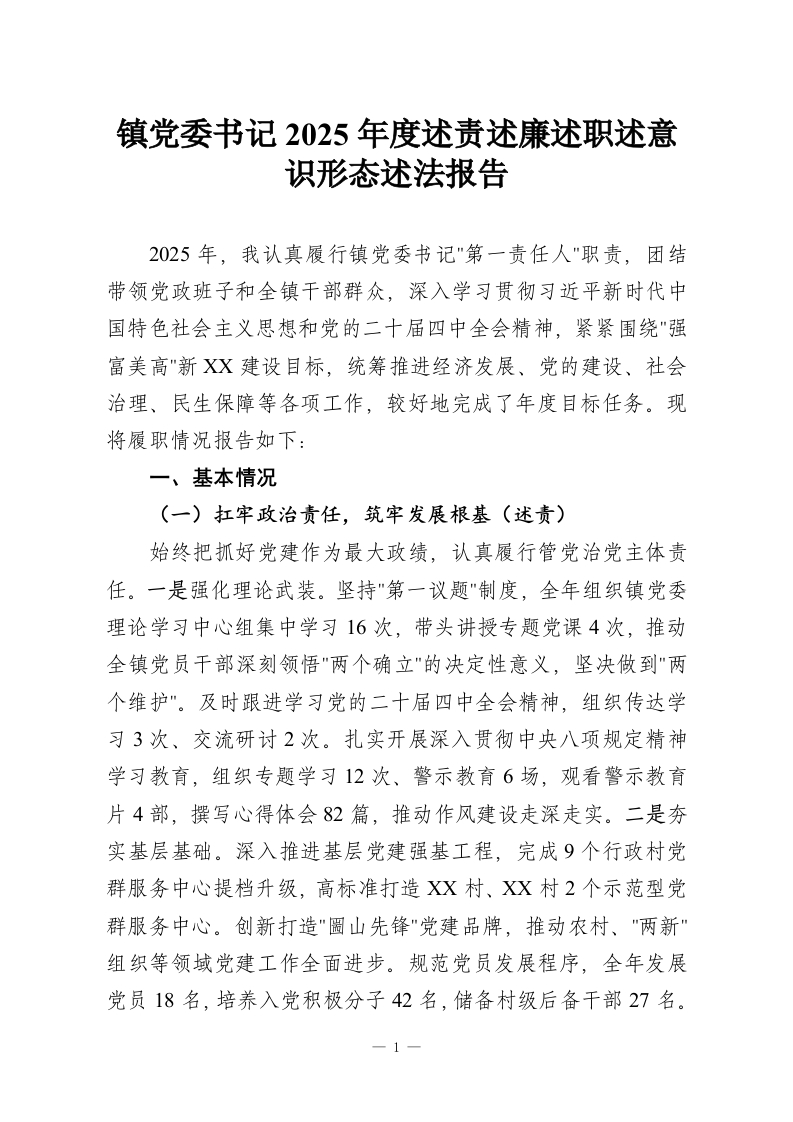 镇党委书记2025年度述责述廉述职述意识形态述法报告