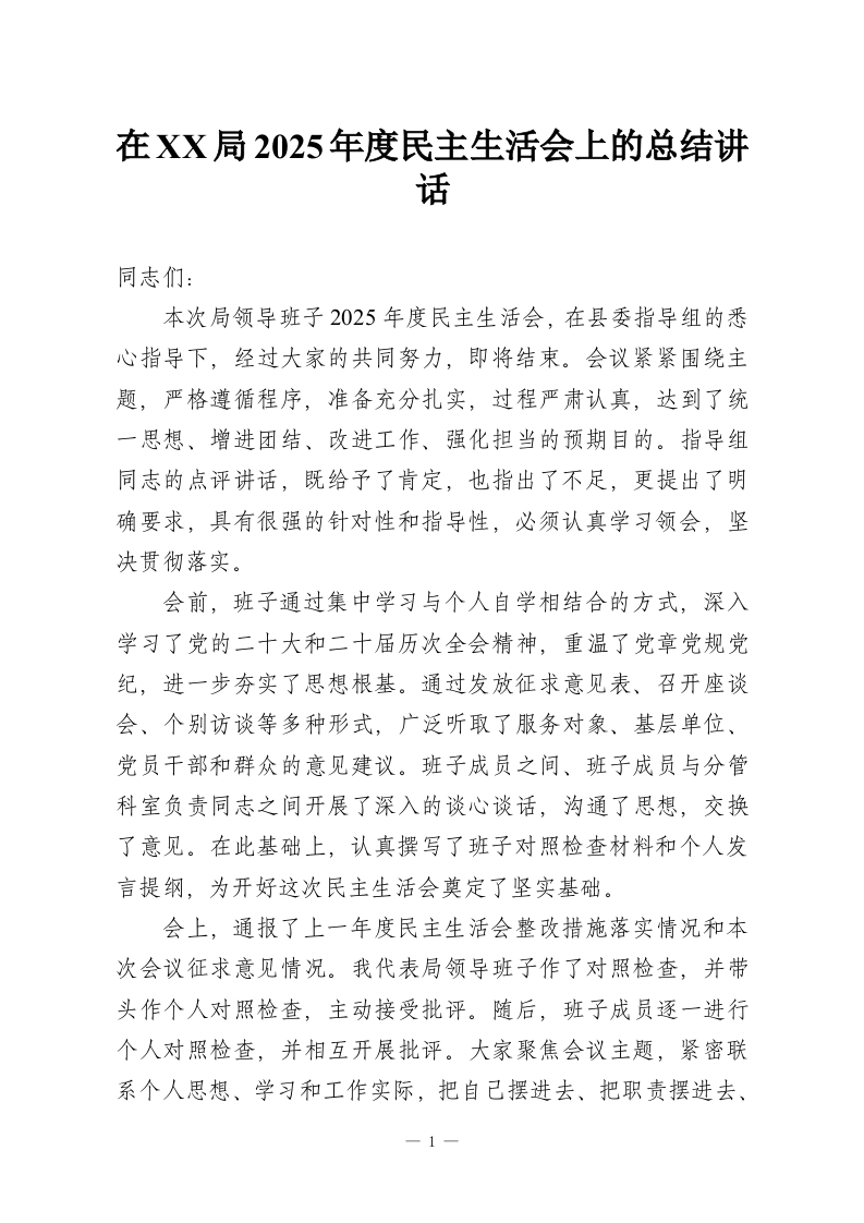首页讲课讲稿在XX局2025年度民主生活会上的总结讲话