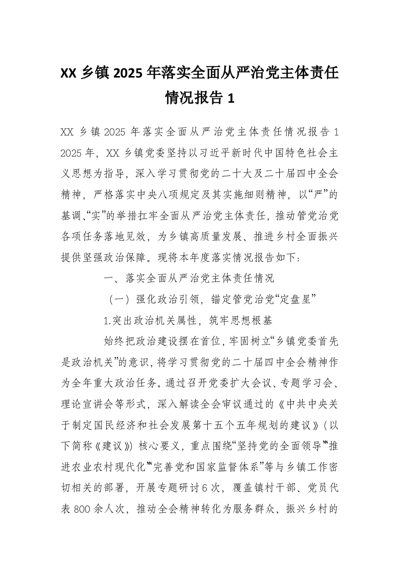 XX乡镇2025年落实全面从严治党主体责任情况报告1