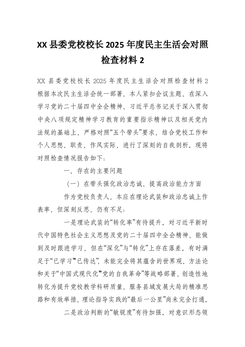 首页材料汇编XX县委党校校长2025年度民主生活会对照检查材料2
