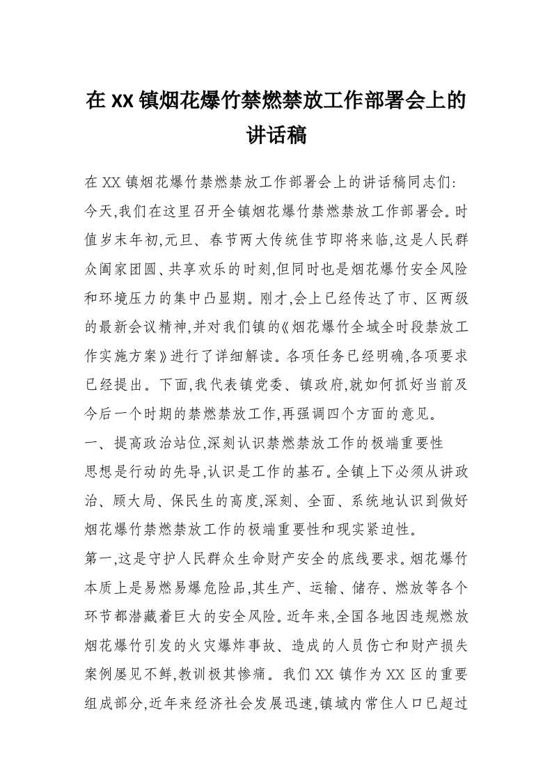 在XX镇烟花爆竹禁燃禁放工作部署会上的讲话稿