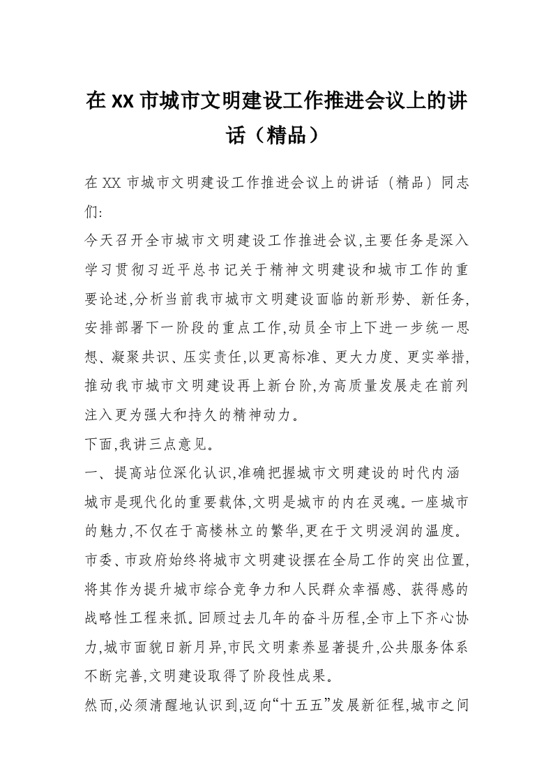 在XX市城市文明建设工作推进会议上的讲话(精品)