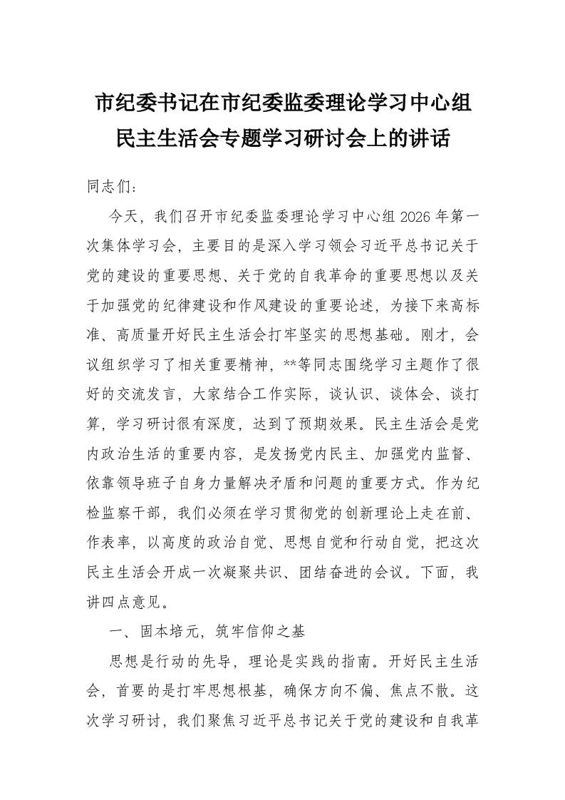 市纪委书记在市纪委监委理论学习中心组民主生活会专题学习研讨会上的讲话