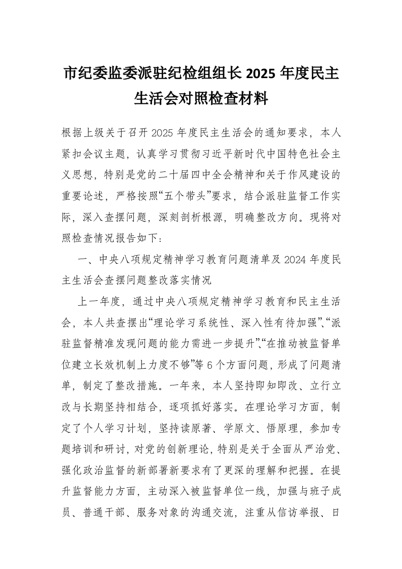 市纪委监委派驻纪检组组长2025年度民主生活会对照检查材料