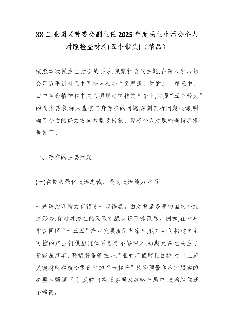XX工业园区管委会副主任2025年度民主生活会个人对照检查材料(五个带头)(精品)_副本