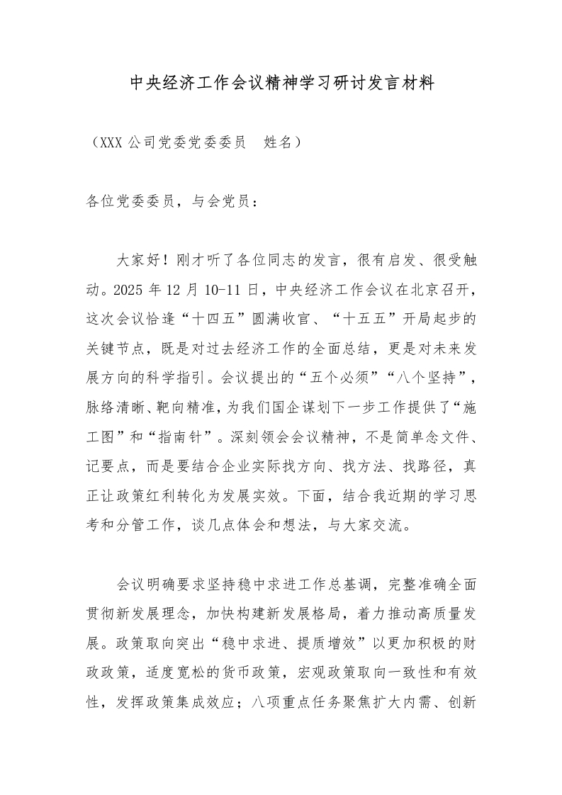 中央经济工作会议精神学习研讨发言材料_副本