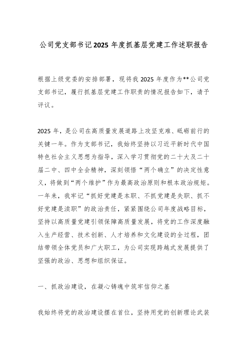 首页精选范文公司党支部书记2025年度抓基层党建工作述职报告_副本