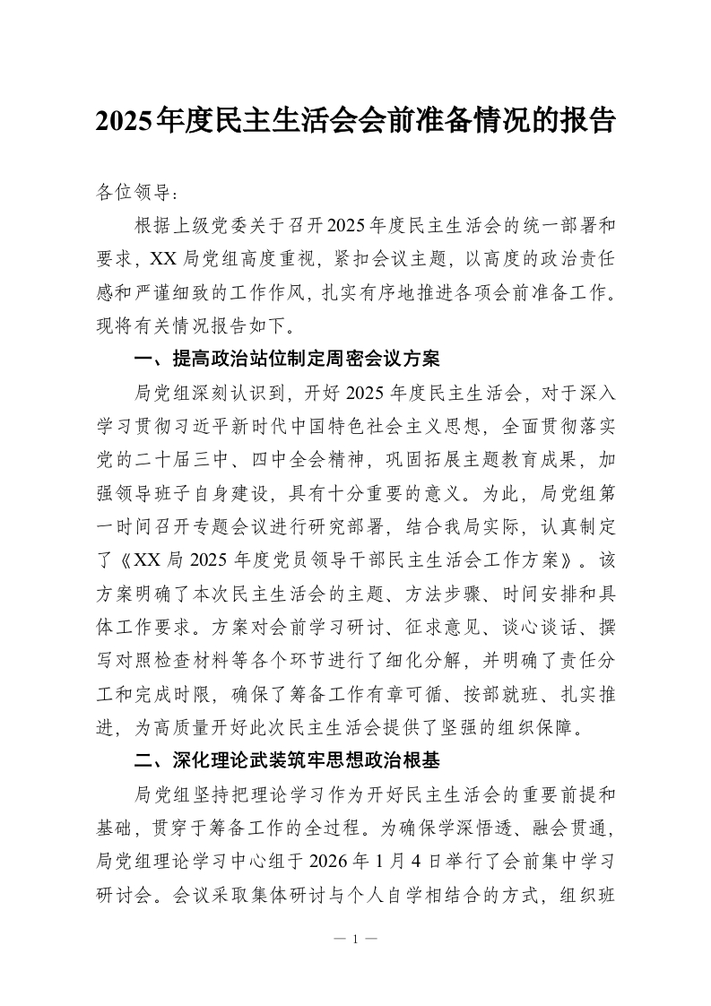 首页讲课讲稿2025年度民主生活会会前准备情况的报告