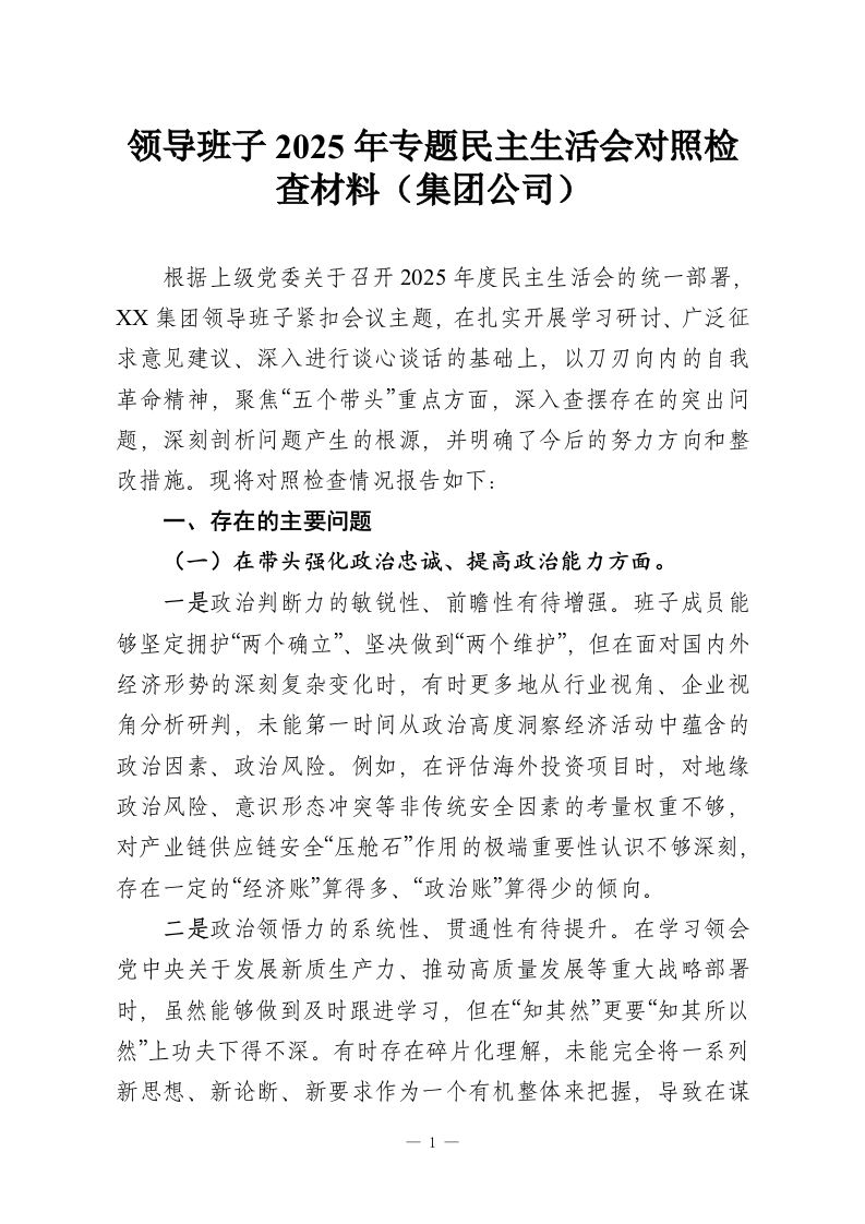 首页讲课讲稿领导班子2025年专题民主生活会对照检查材料(集团公司)