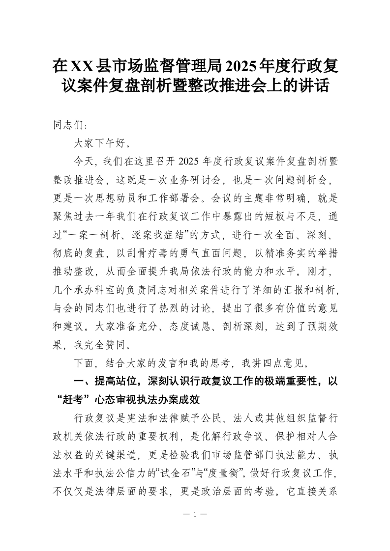 在XX县市场监督管理局2025年度行政复议案件复盘剖析暨整改推进会上的讲话