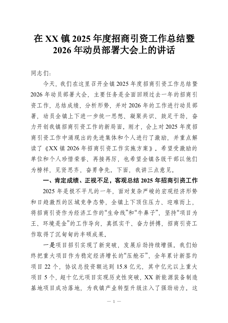 在XX镇2025年度招商引资工作总结暨2026年动员部署大会上的讲话