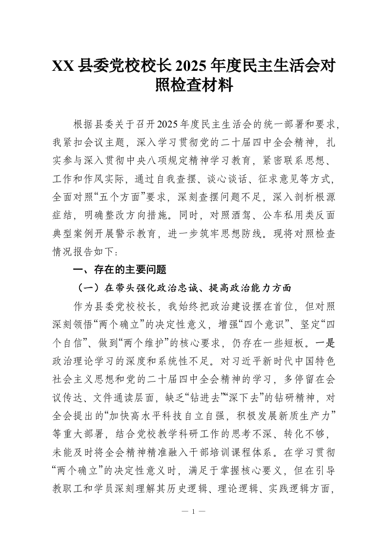 首页讲课讲稿XX县委党校校长2025年度民主生活会对照检查材料