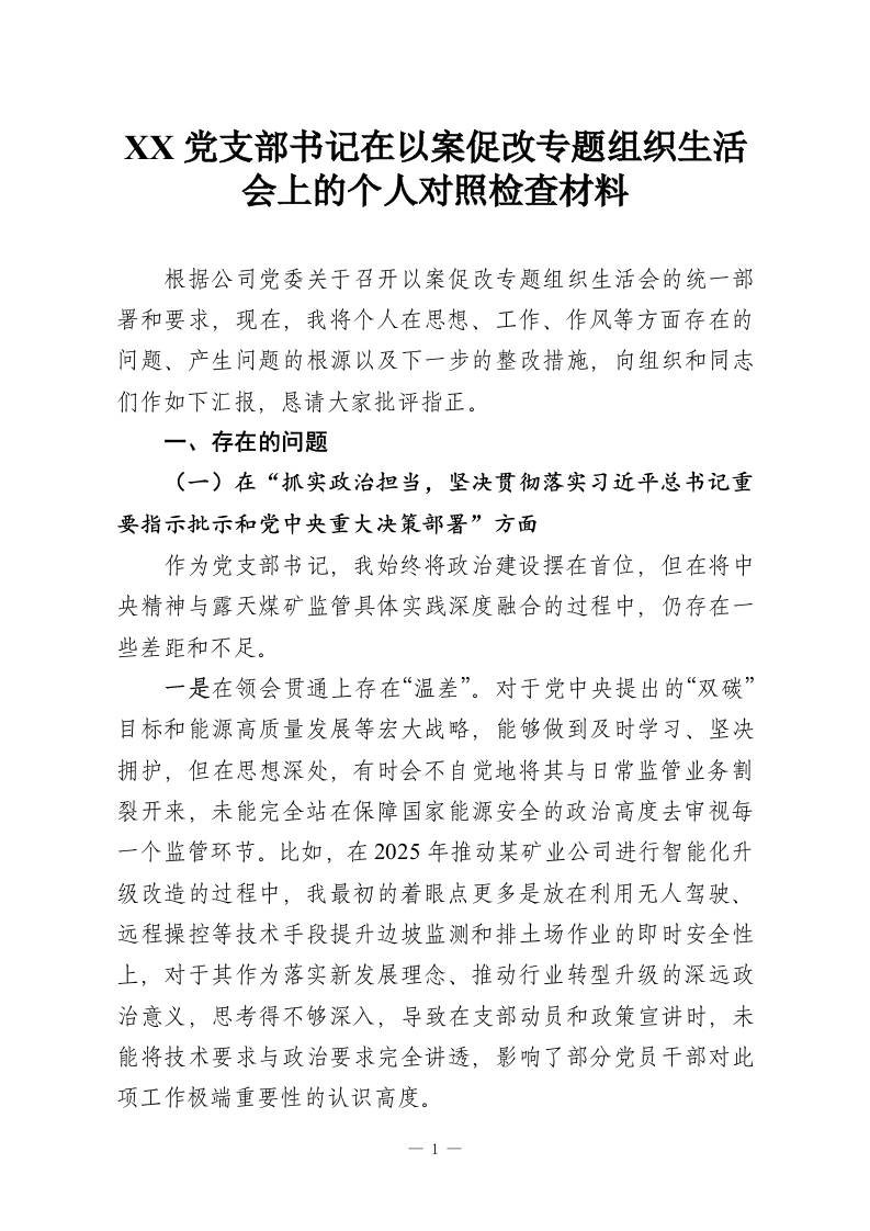 XX党支部书记在以案促改专题组织生活会上的个人对照检查材料