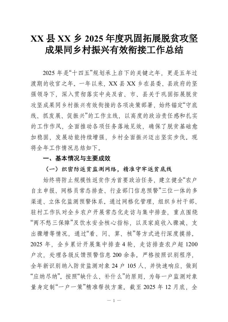 XX县XX乡2025年度巩固拓展脱贫攻坚成果同乡村振兴有效衔接工作总结