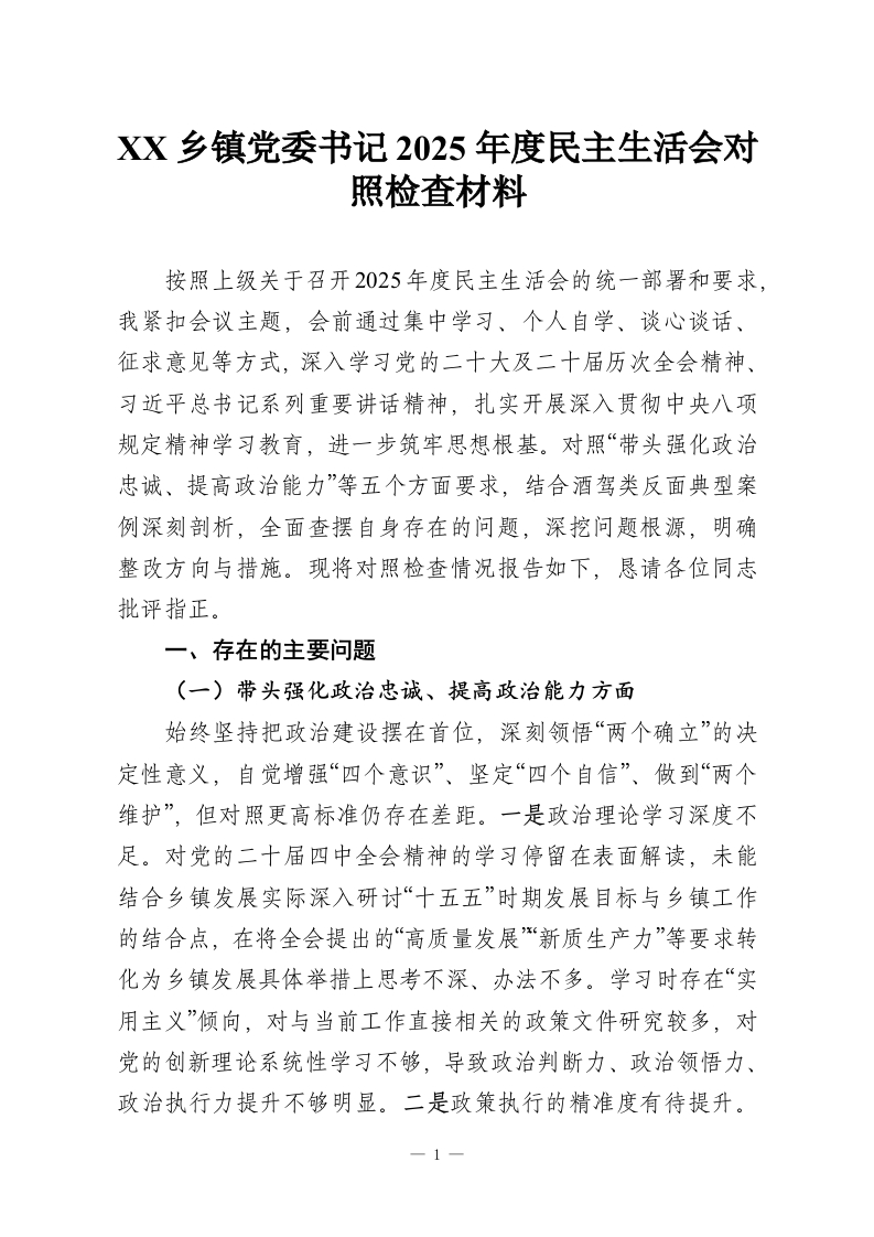 XX乡镇党委书记2025年度民主生活会对照检查材料