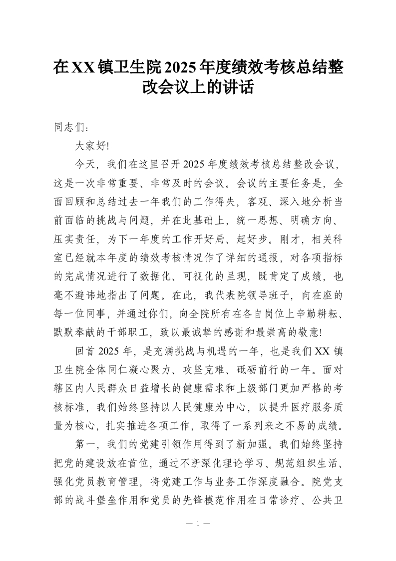 在XX镇卫生院2025年度绩效考核总结整改会议上的讲话