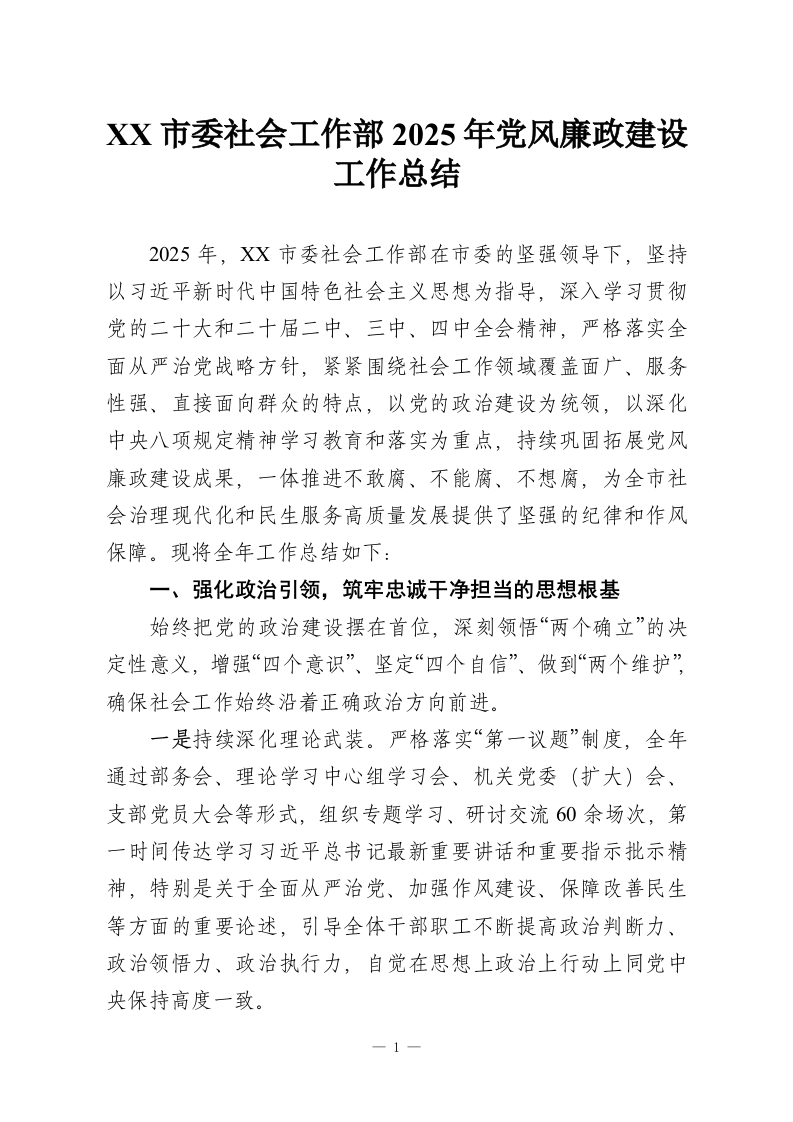 XX市委社会工作部2025年党风廉政建设工作总结
