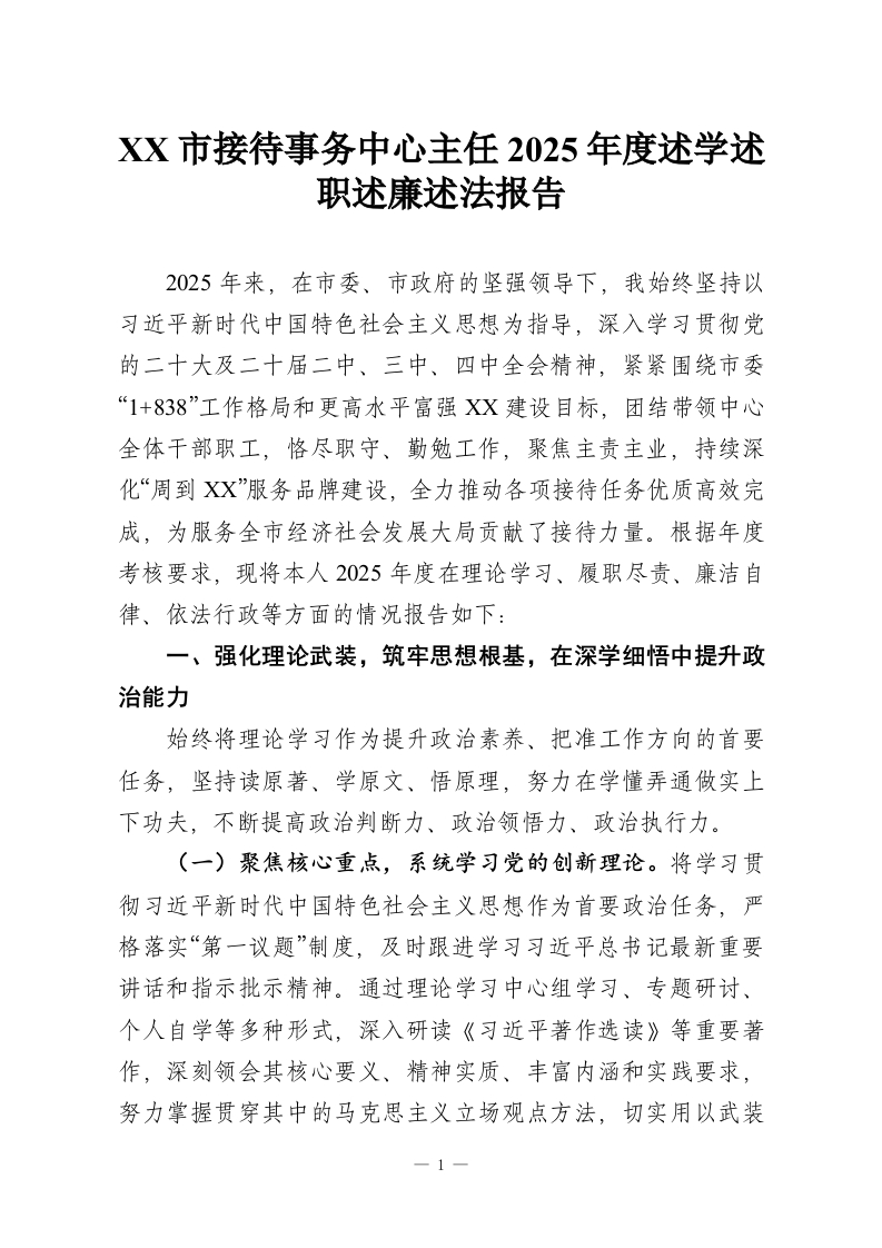 XX市接待事务中心主任2025年度述学述职述廉述法报告