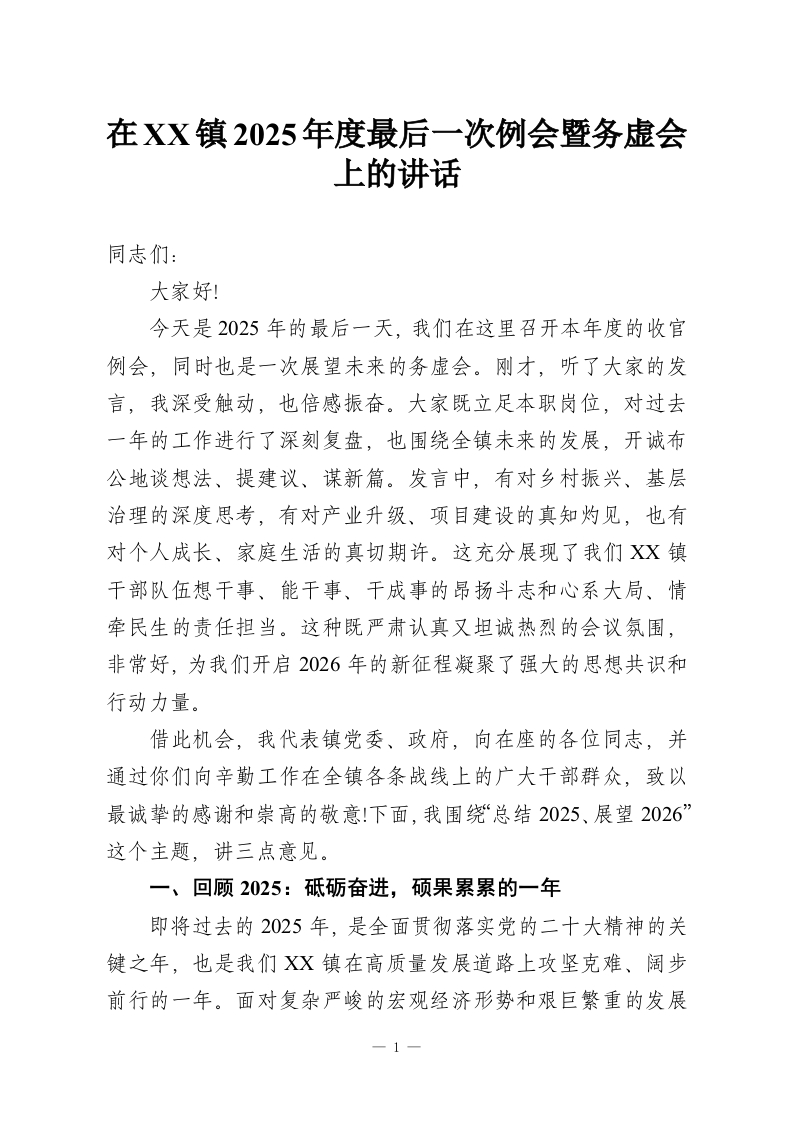 在XX镇2025年度最后一次例会暨务虚会上的讲话