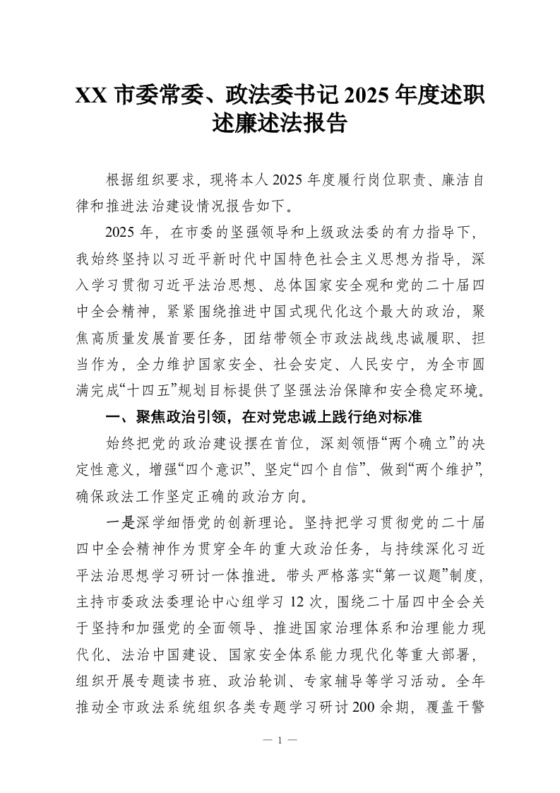 XX市委常委、政法委书记2025年度述职述廉述法报告