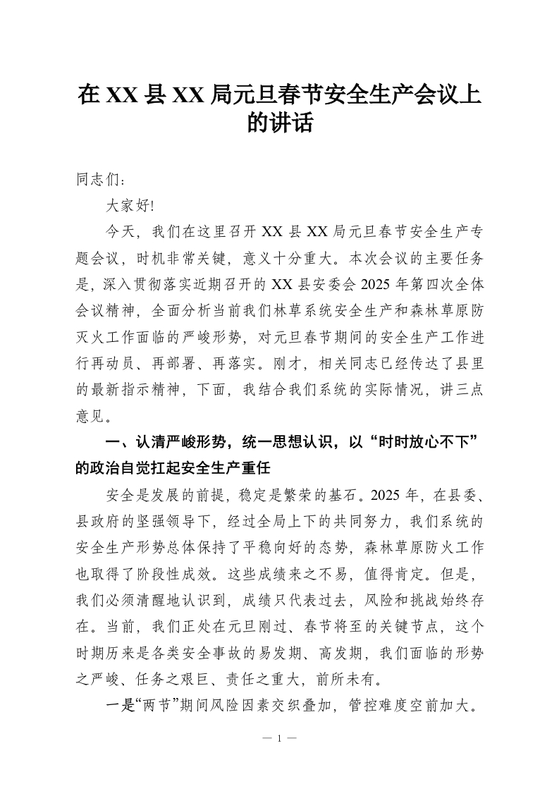 在XX县XX局元旦春节安全生产会议上的讲话
