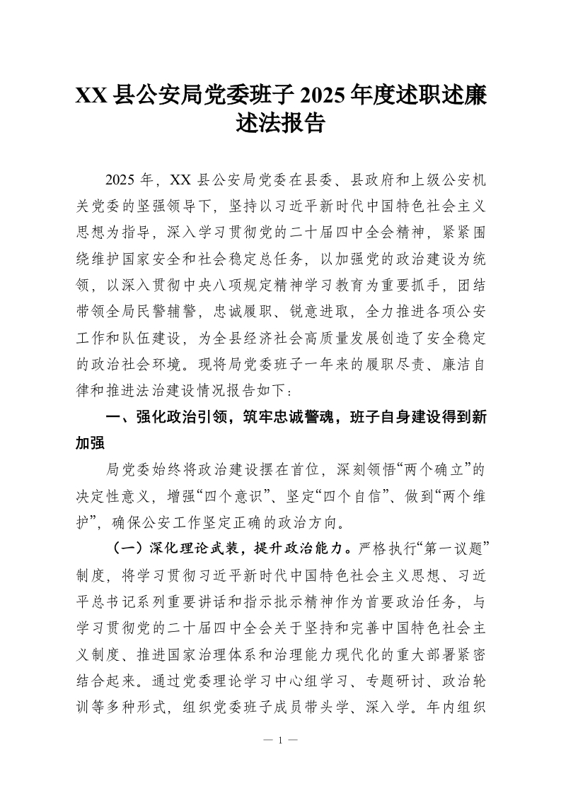 首页写作素材XX县公安局党委班子2025年度述职述廉述法报告
