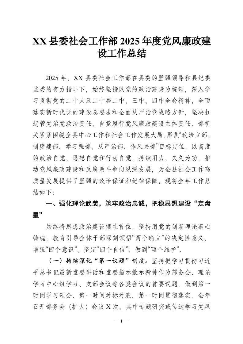 XX县委社会工作部2025年度党风廉政建设工作总结