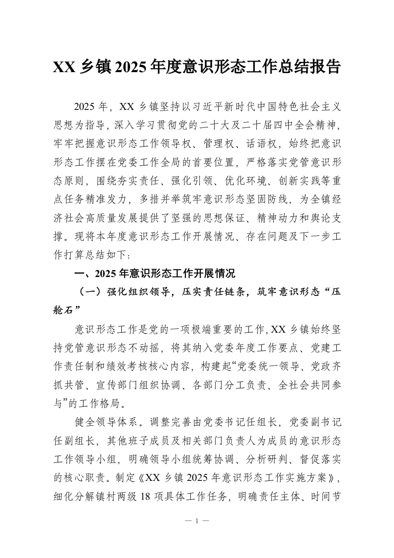 XX乡镇2025年度意识形态工作总结报告