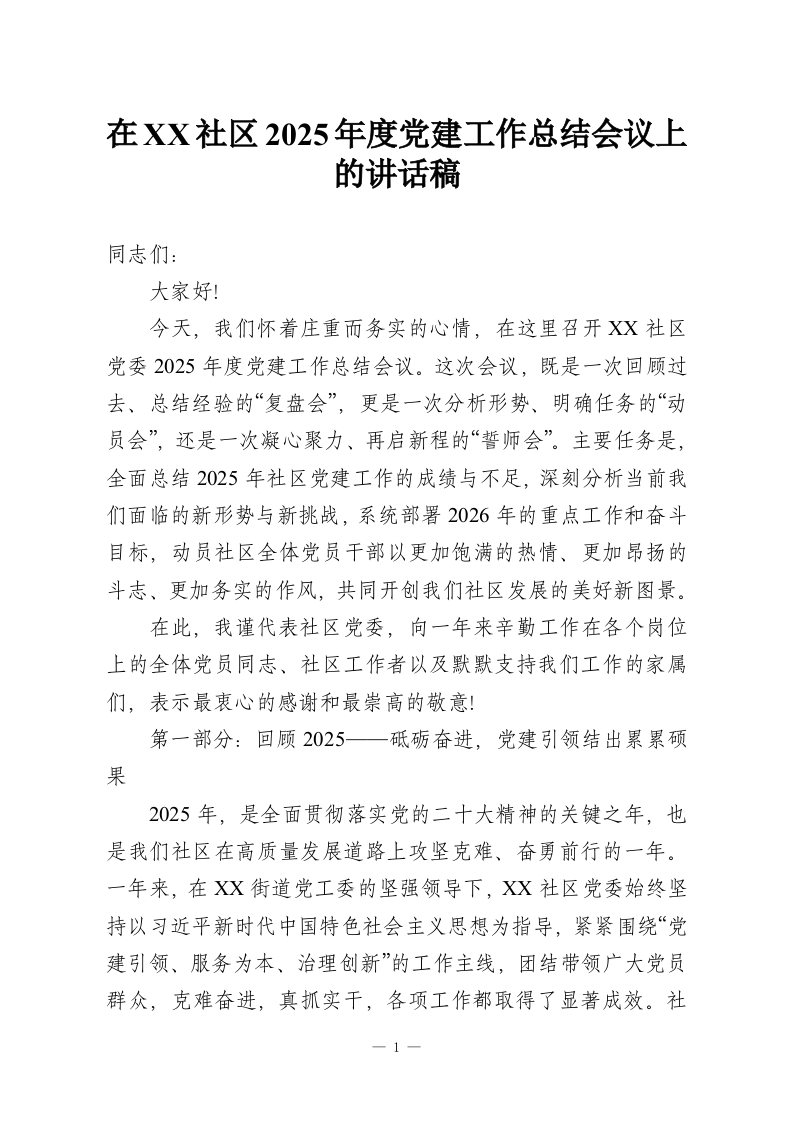 在XX社区2025年度党建工作总结会议上的讲话稿