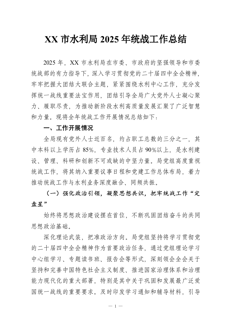 XX市水利局2025年统战工作总结