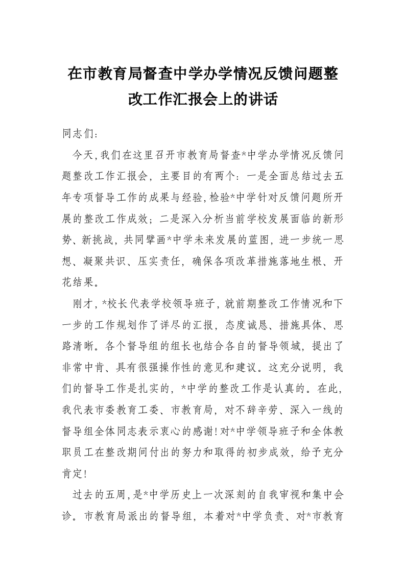 在市教育局督查中学办学情况反馈问题整改工作汇报会上的讲话